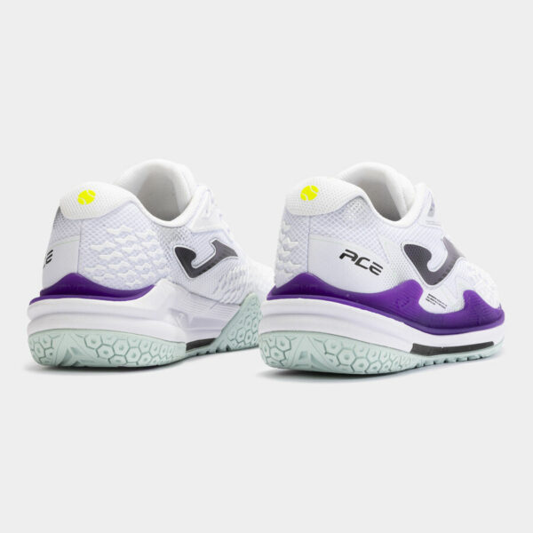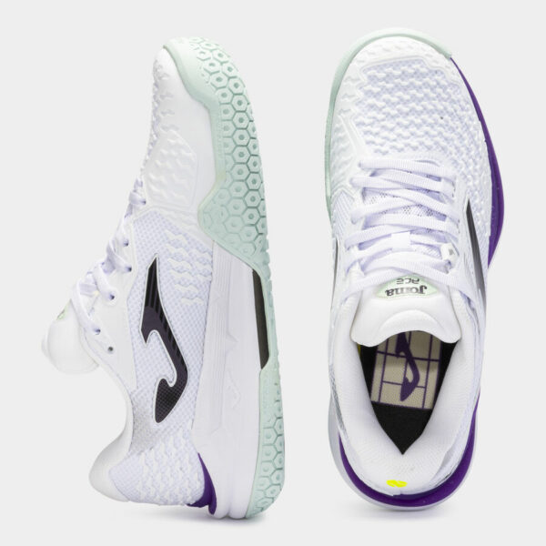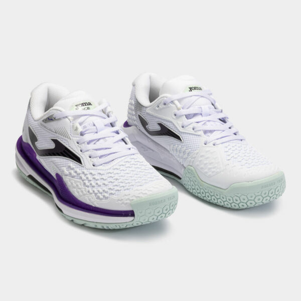 Semelle en caoutchouc DURABILITY all court, adaptée et résistante pour jouer sur terrain dur/réactif. Le dessin permet à la joueuse de glisser et de freiner sur le court selon ses besoins.