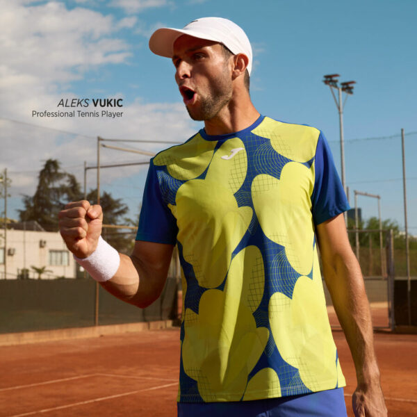 Coupe construite en tissu piqué, qui donne une touche très élégante au vêtement. Le point élastique permet une adaptation au corps du joueur de tennis et sa liberté de mouvement. Un sublimé a été ajouté pour simuler des figures en mouvement afin de donner dynamisme et modernité au t-shirt.