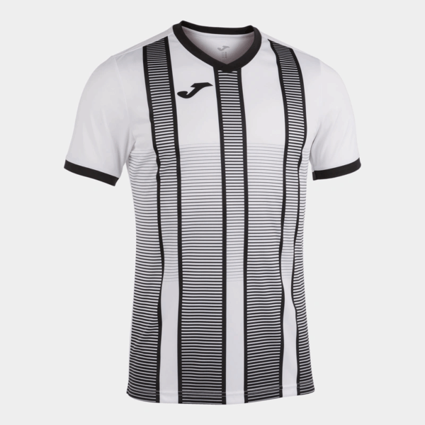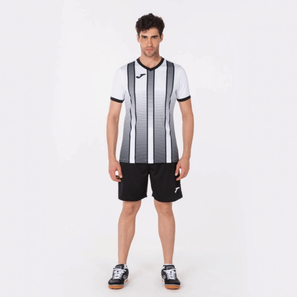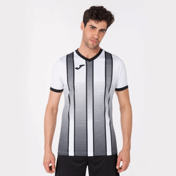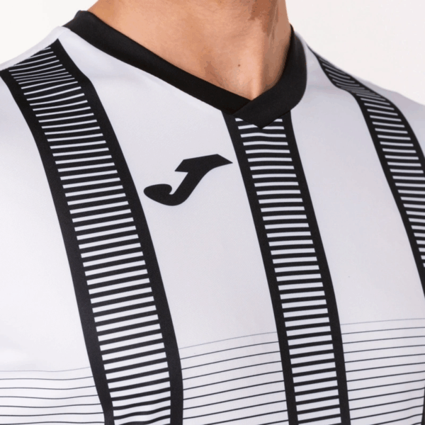 T-shirt à manches courtes et col en V. Devant sublimé avec effet rayures verticales. Logo J sublimé.