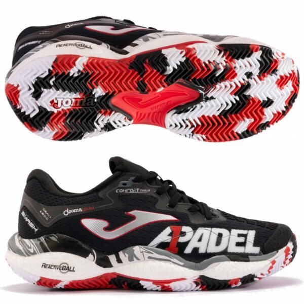 Découvrez les chaussures de padel noires Joma Smash Men 2481, conçues pour optimiser vos performances sur le court avec une technologie de pointe, une semelle en terre battue et du style